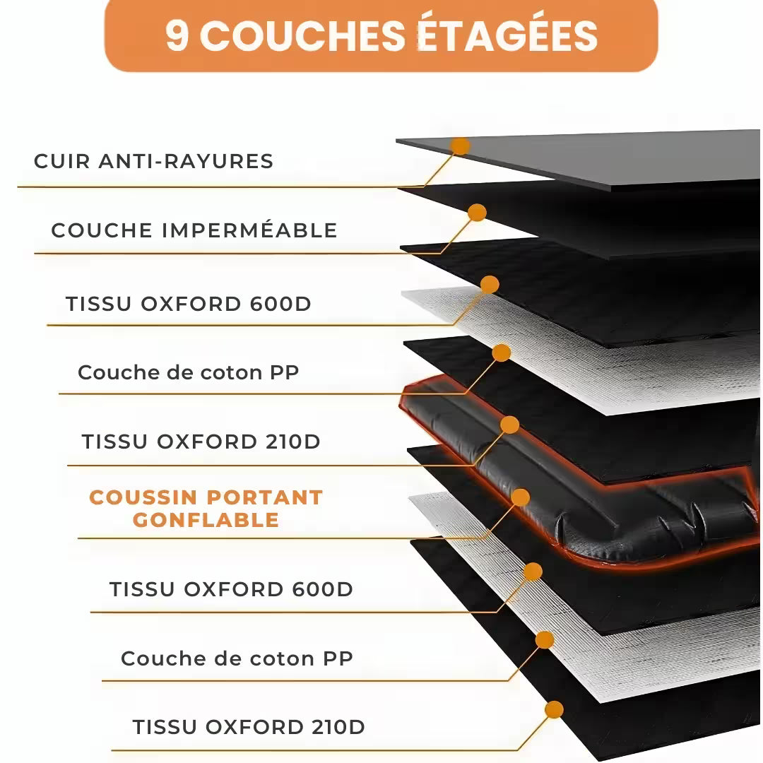 K9 GuardShield + est la seule housse de voiture avec matelas gonflable intégré. Elle absorbe les secousses, maintient votre chien bien en place, et transforme chaque trajet en un vrai moment de détente.